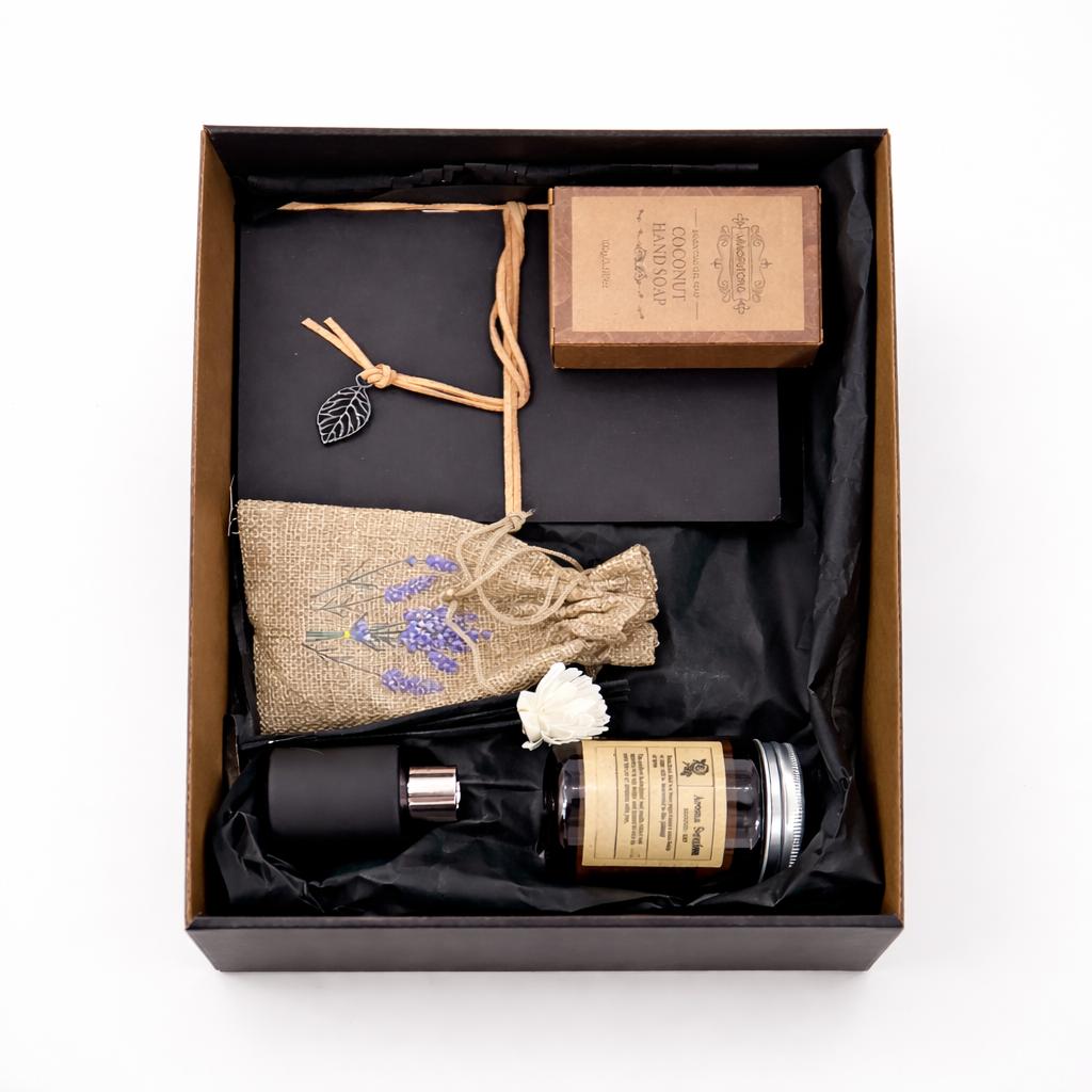 It contains a scented candle, scented soap, lavender sachet, notebook, and diffuser Beautifully packaged with a card for all occasions